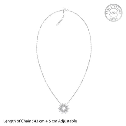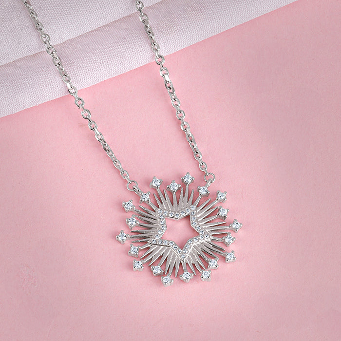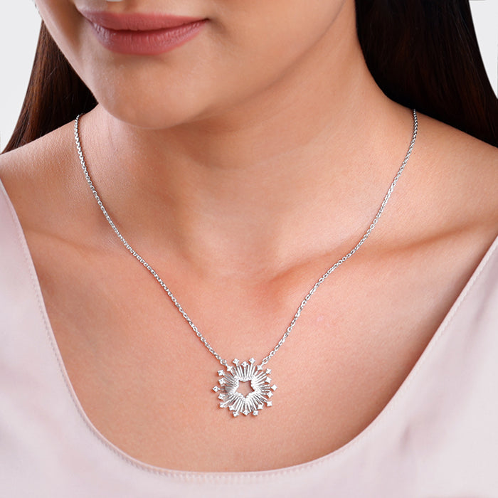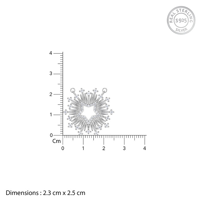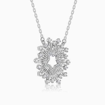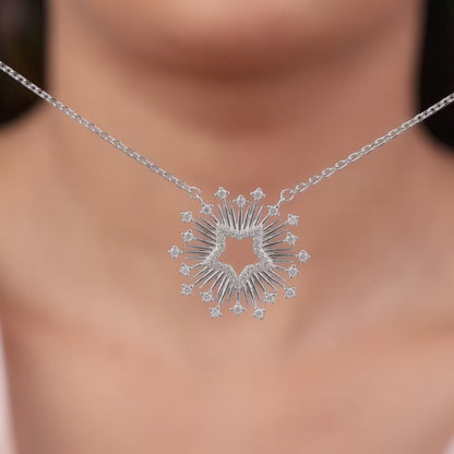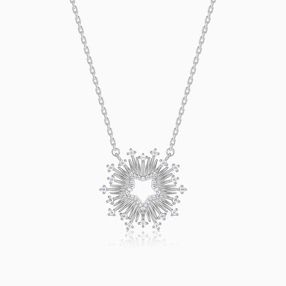 This silver necklace for women features a star motif. Surrounding the star are stardust-like trails, each with a sparkling zircon.