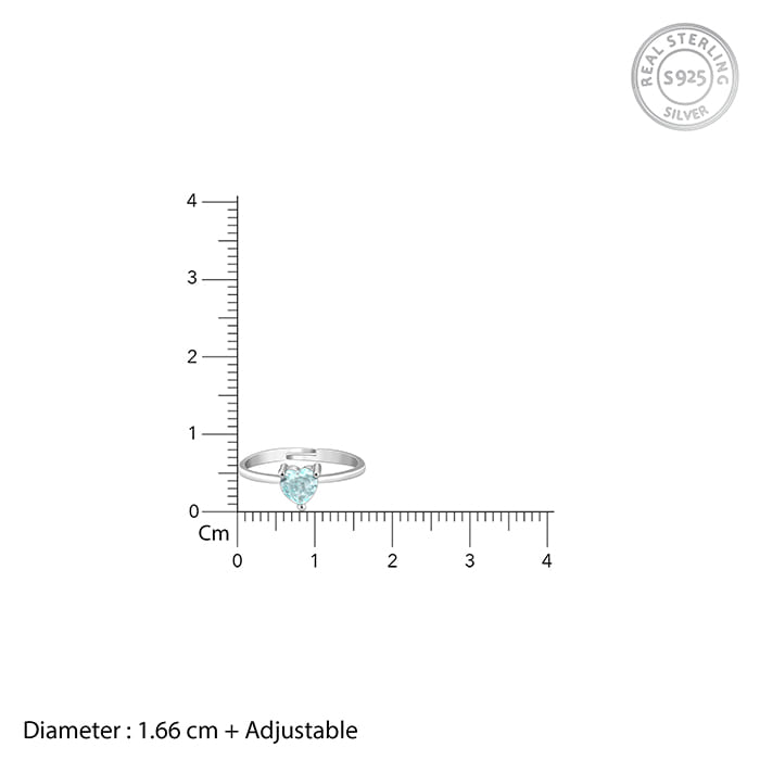 This silver ring features a heart motif set with a blue coloured stone.