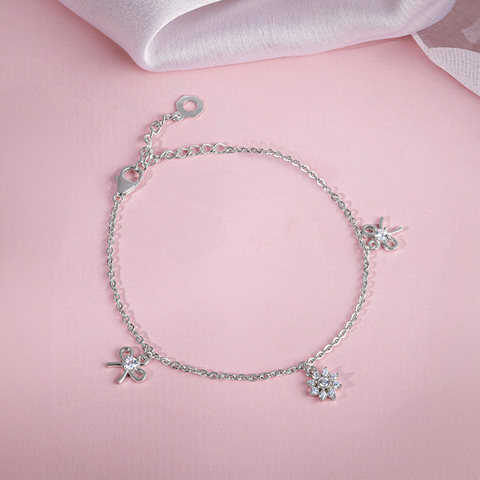 This silver bracelet for women showcases a flower motif and two elegant bow motifs. Each is beautifully studded with sparkling zircons.