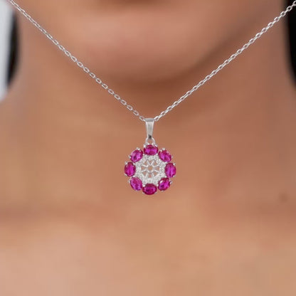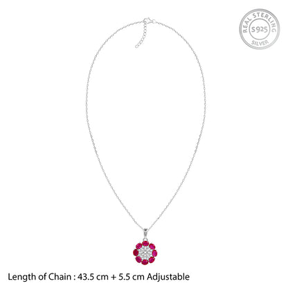 This silver pendant with a link chain for women features a beautiful flower motif. The design is brought to life with coloured stones encircling shimmering zircons.