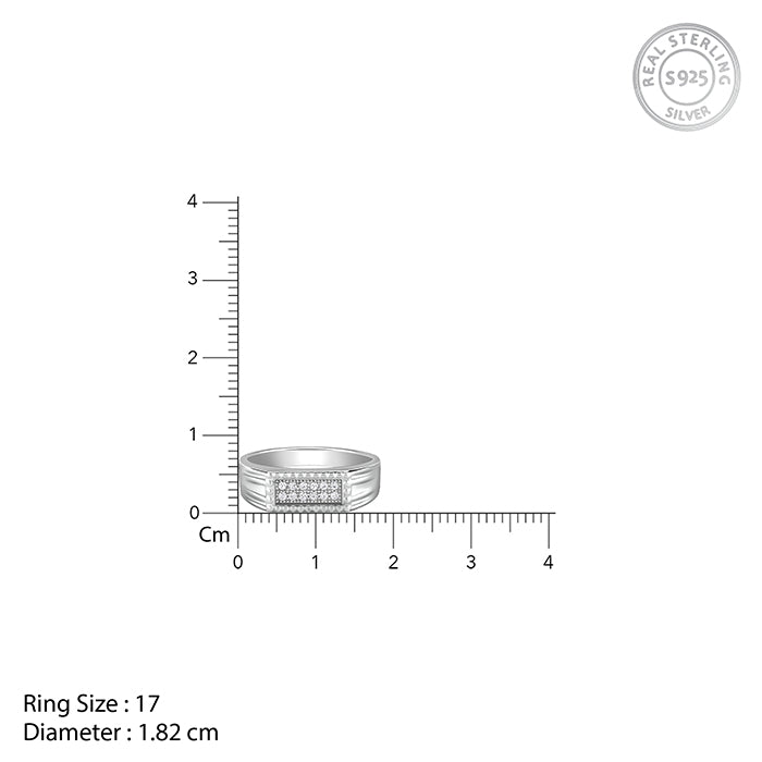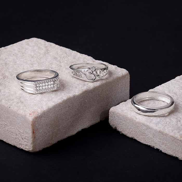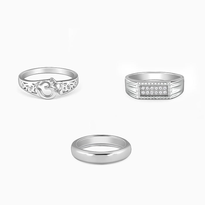 This silver set for men includes three rings. The first ring features a rectangular zircon-studded centre and an intricate band at the sides. The second ring showcases a classic band design. The third ring for men is set with an Om symbol at the centre, flanked by intricate cut-out patterns along the band.