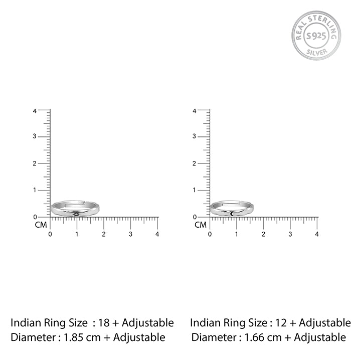 These silver couple bands feature a classic wave-like design. The male band features a sun motif engraved at the centre, while the female band has a moon.
