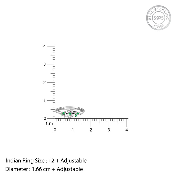 This silver ring for women features a stylised floral design with a green coloured stone at the centre, flanked by a cluster of zircon and coloured stones.
