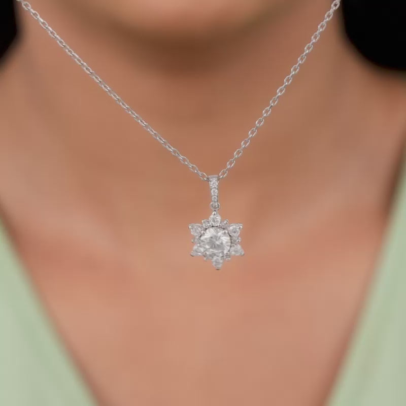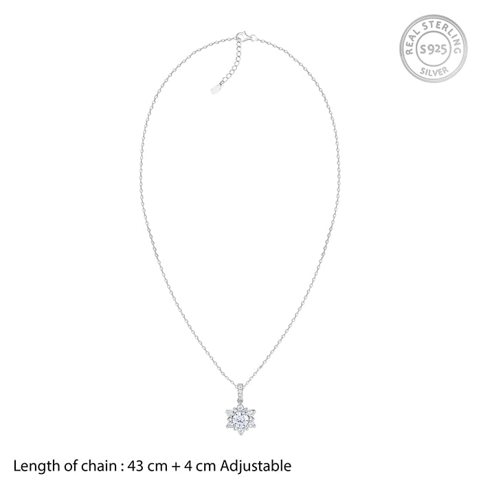 This silver pendant for women features a starburst design, with small zircons radiating around a large central zircon.