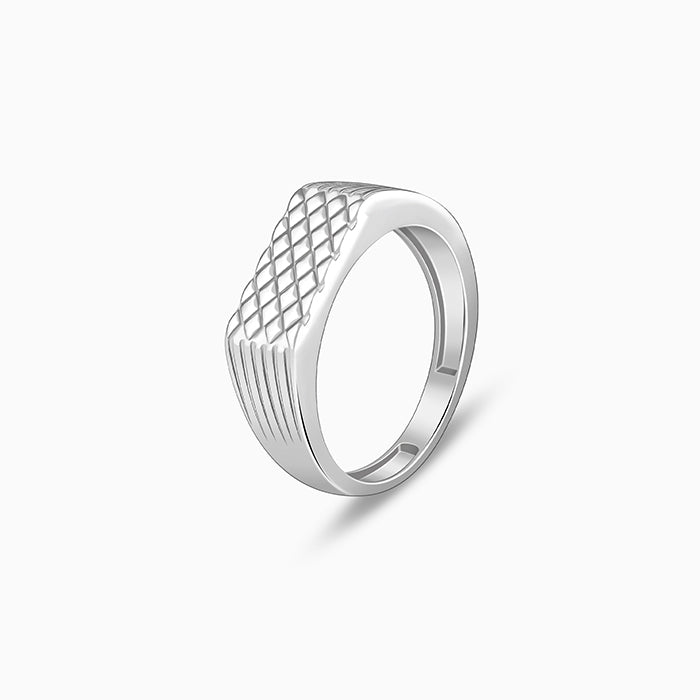 This silver mens ring features diamond-shaped engravings at the centre. The band carries a bold geometric texture.