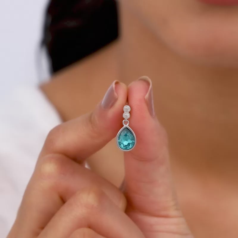 These silver earrings feature a turquoise-blue tear drop dangling from two circular zircons.