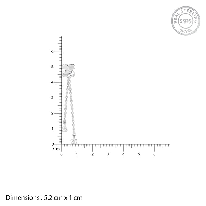These silver earrings for women feature a floral design. One of the petals is accented with sparkling zircons. Dual chains dangle below, ending in a flower motif.