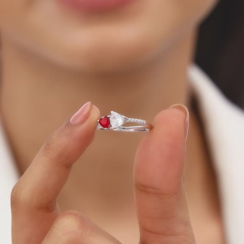 This silver ring features two heart motifs, one adorned with a coloured stone and the other with a zircon, placed in the centre of zircon studded loop. Celebrate your moments of passion with GIVA’s Red Romance Collection.
