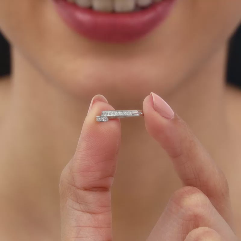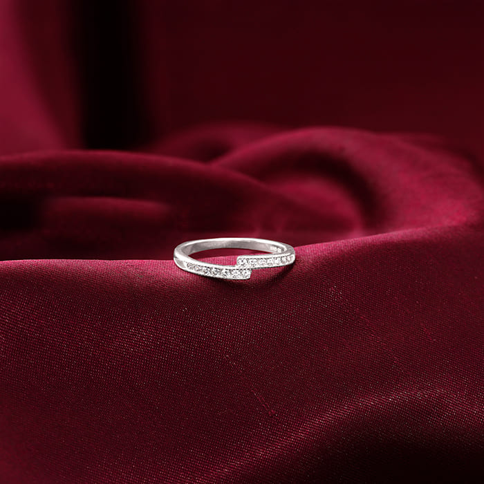 This silver ring features an asymmetric band with an overlap studded with zircons.