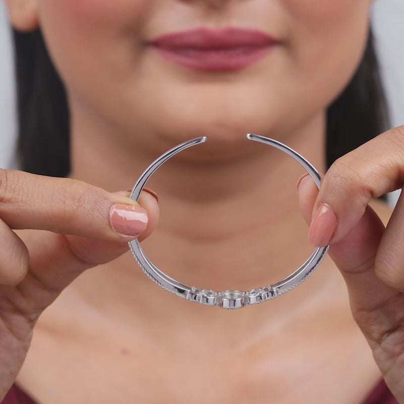 Blending regal influence with a modern spirit, this silver bracelet centres on a radiant zircon framed by leaf motifs on either side. The structured form and clean sparkle give the piece a confident, royal edge.