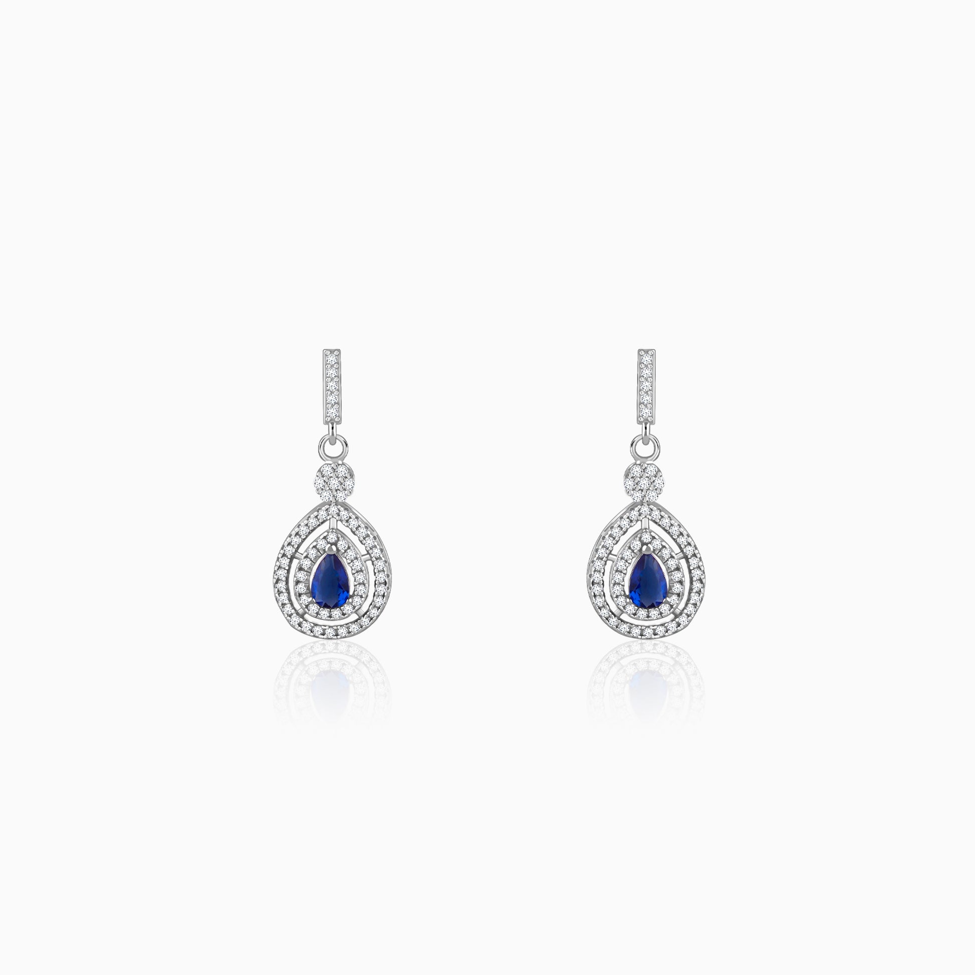 Inspired by rhythmic symmetry, these silver earrings feature round motifs set with zircons that flow seamlessly into a pear-shaped form. A striking blue zircon at the centre anchors the design with vivid colour and depth.