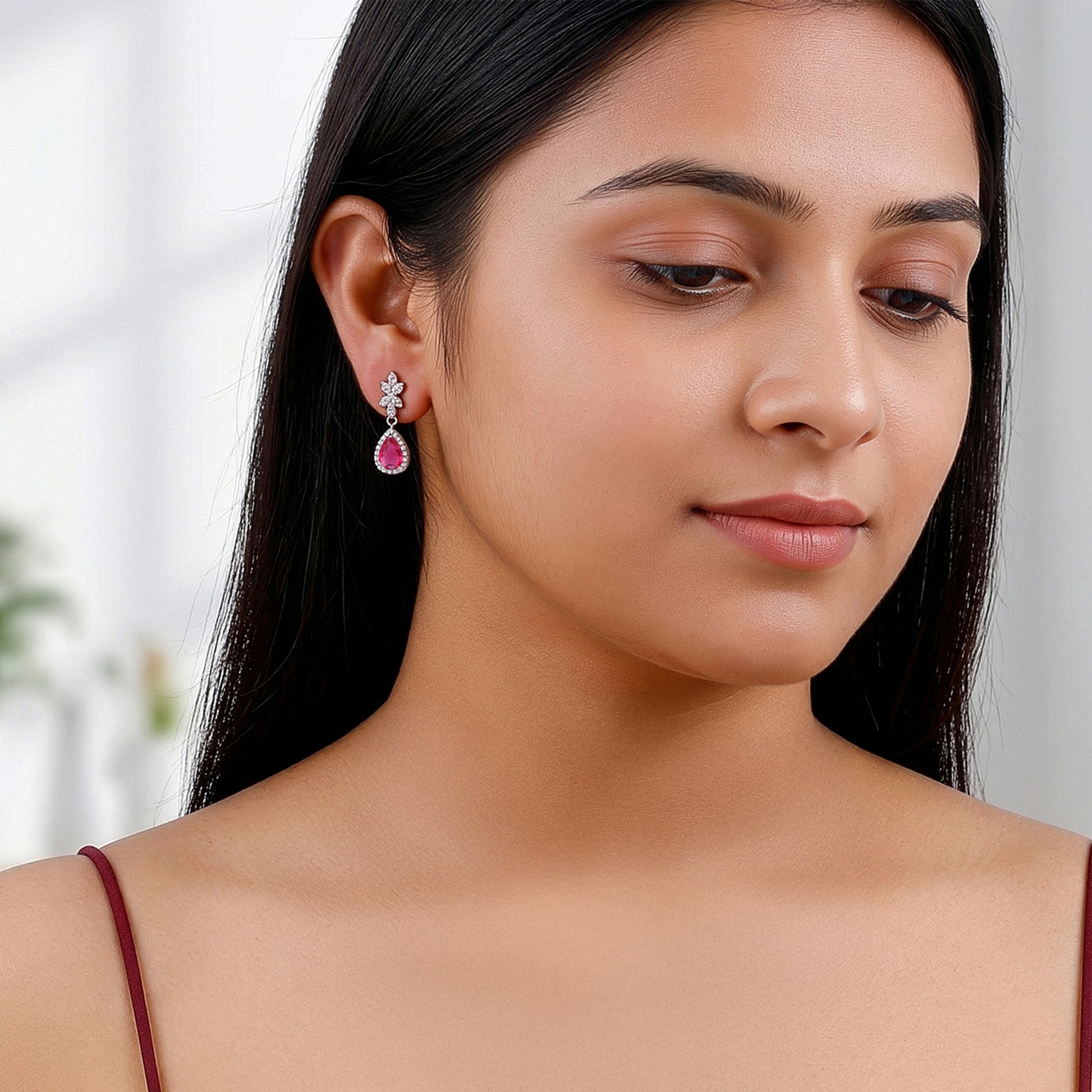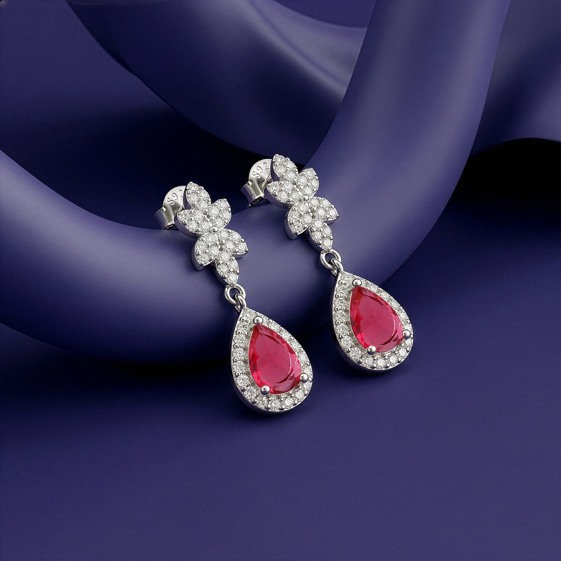 Zircon detailing leads to a striking red teardrop zircon, creating an elegant drop that draws the eye with rich brilliance.