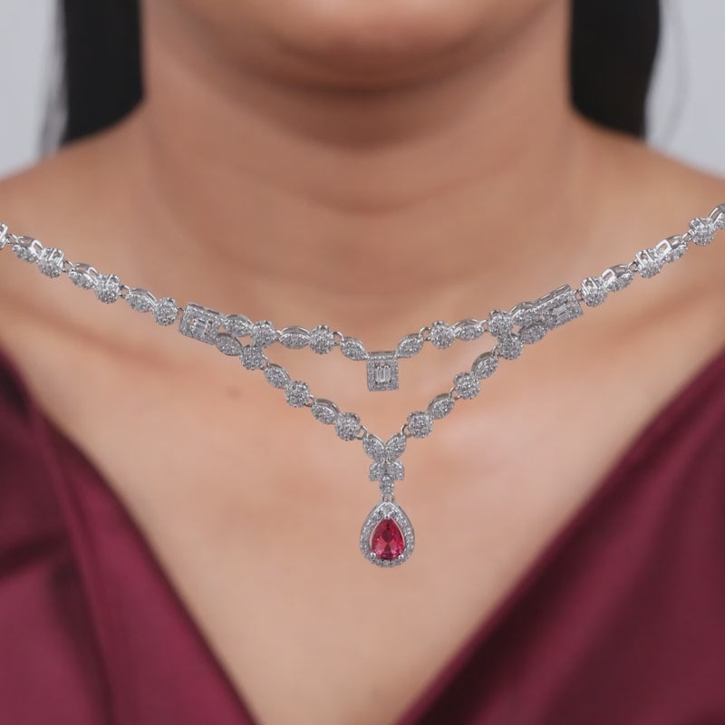 Inspired by royal pendants and heirloom drama, this silver necklace balances shimmer with a bold focal point. Zircon detailing along the neckline leads to a striking red teardrop zircon that commands attention with rich brilliance.