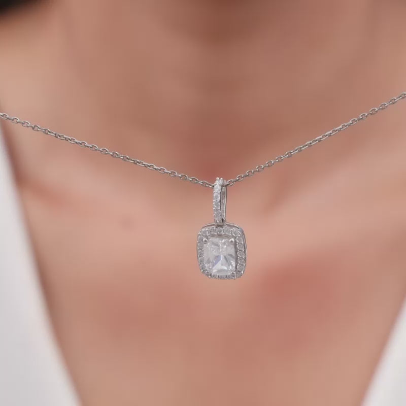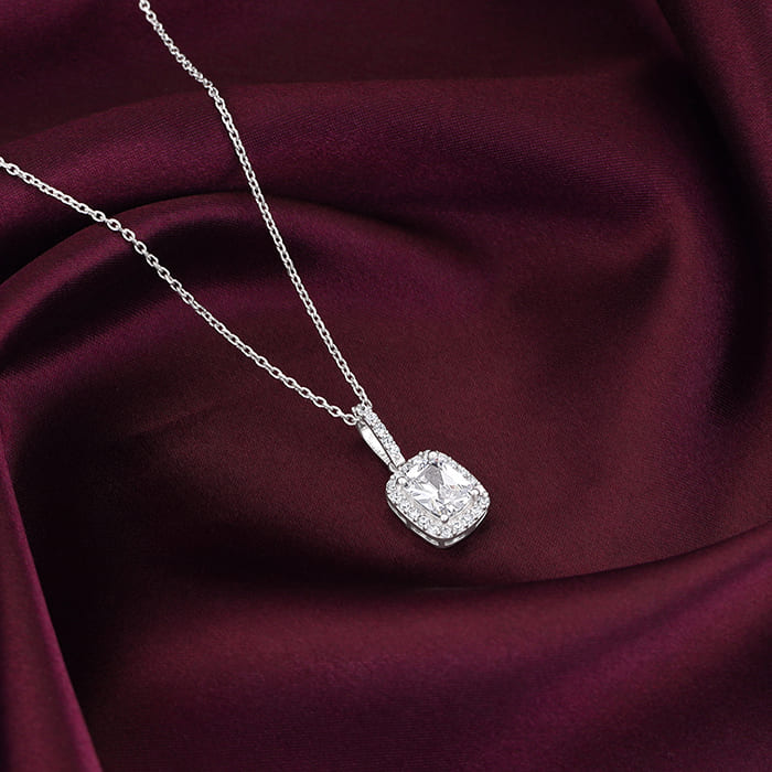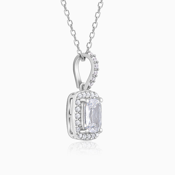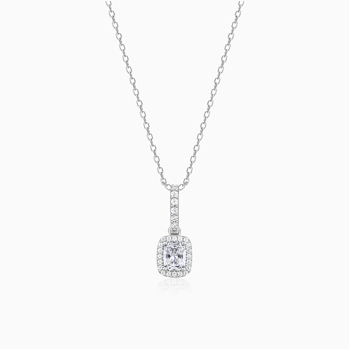 This silver pendant has a rectangular zircon in the middle surrounded by a zircon studded layer hanging from a line of zircons.