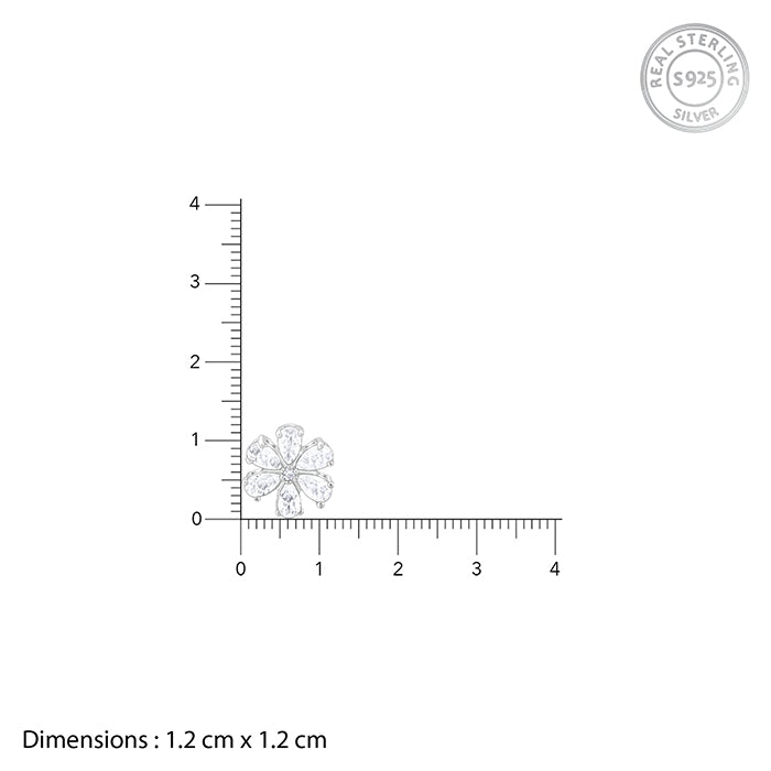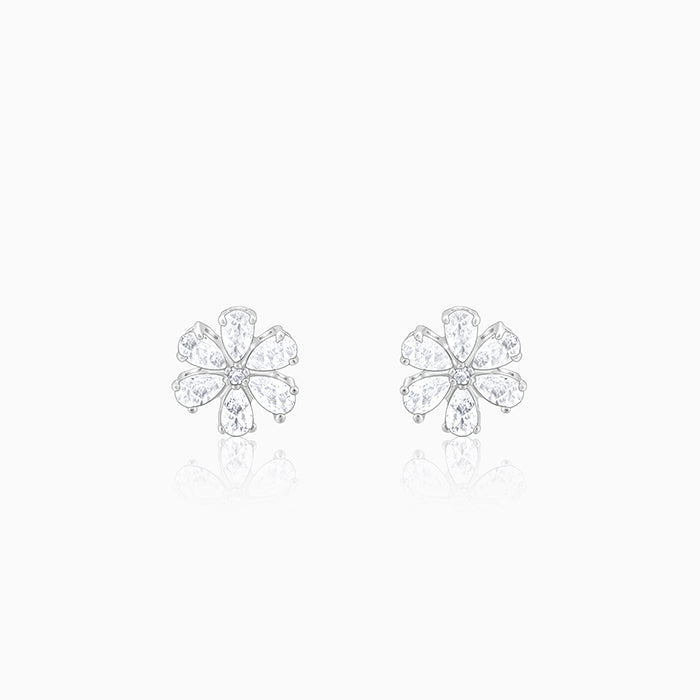 These silver earrings feature a flower motif set with zircons.