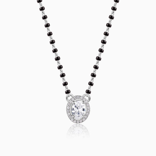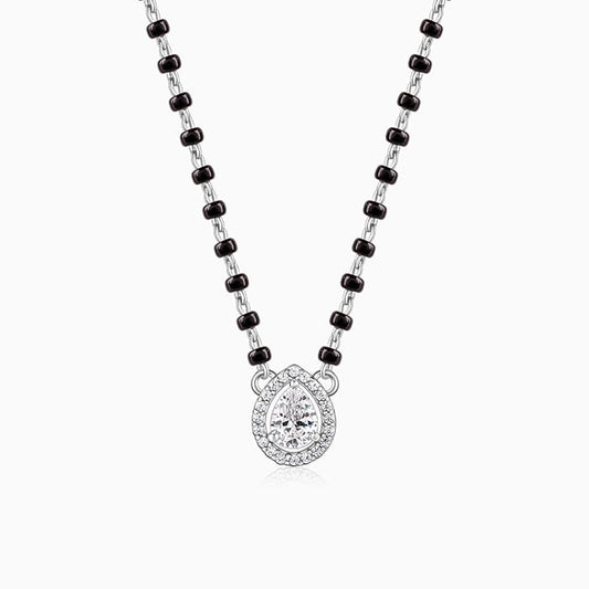 This silver mangalsutra features a square motif studded with zircons and black beads.
