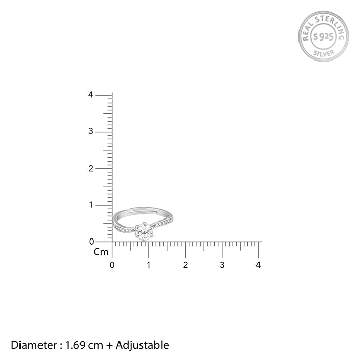 This silver ring features a circular zircon on a band with zircons, that has a slight wave design.