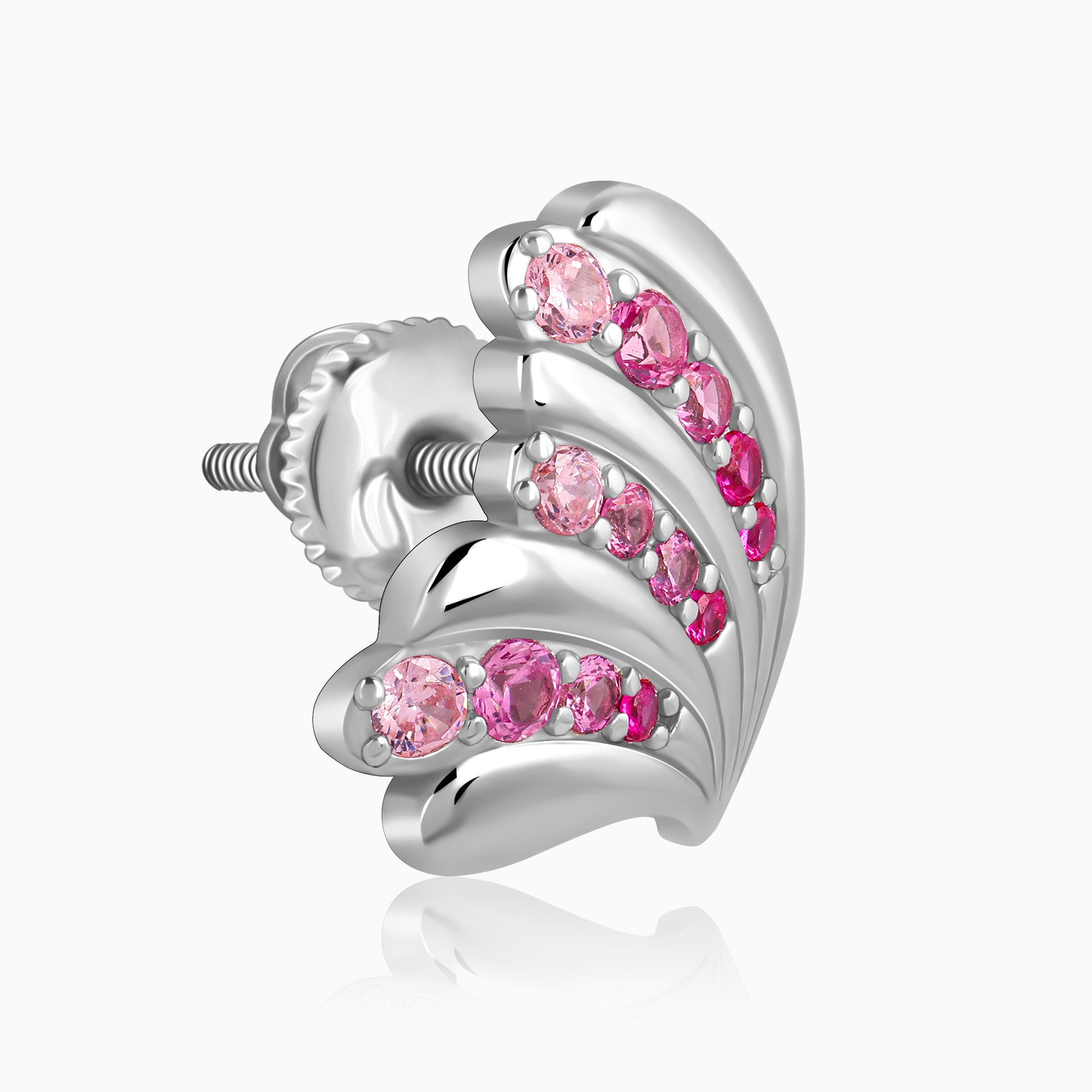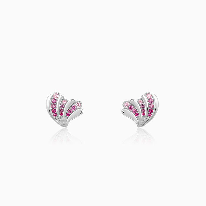 These silver earrings for women features a wing motif with tiered, curved segments, set with alternating pink and zircon stones for a vibrant and textured look.