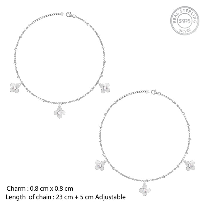 Silver Zircon Clover Charm Anklet