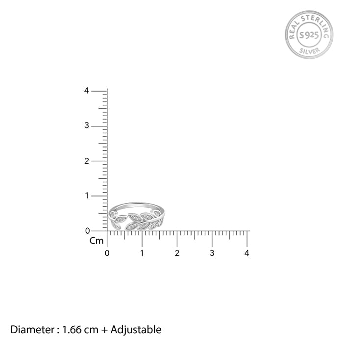 This silver ring has an open design, with two leaf branches sporting zircons on both ends.