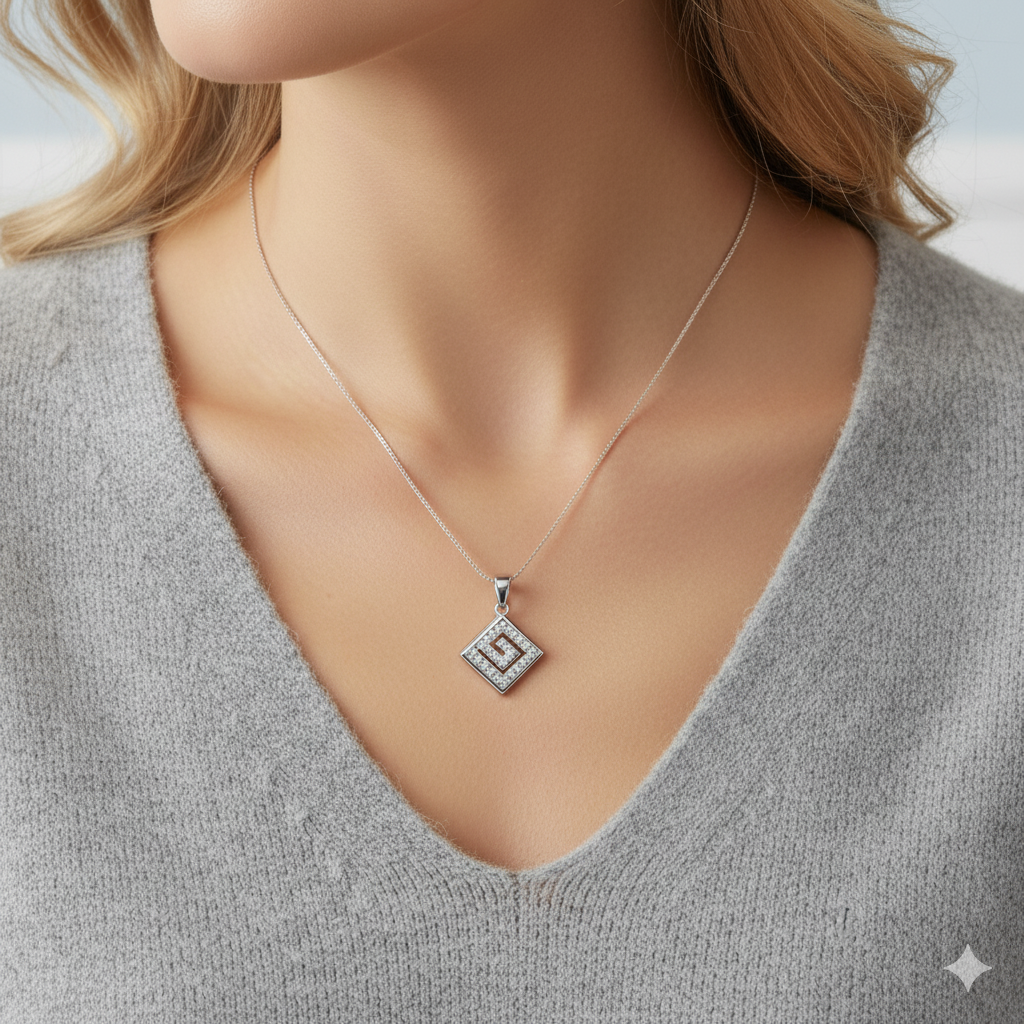 This Silver Zircon Maze Pendant is handcrafted with love, just for YOU. A silver pendant is crafted into an intricate maze, with sparkling zircons embellished along the entire surface. Truly enthralling.