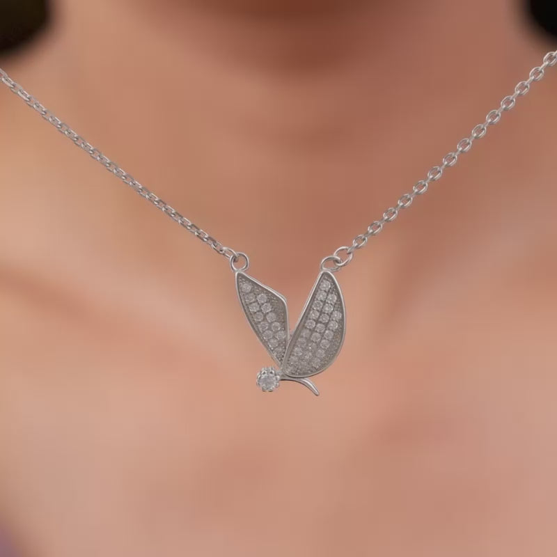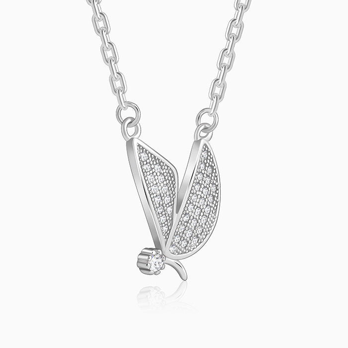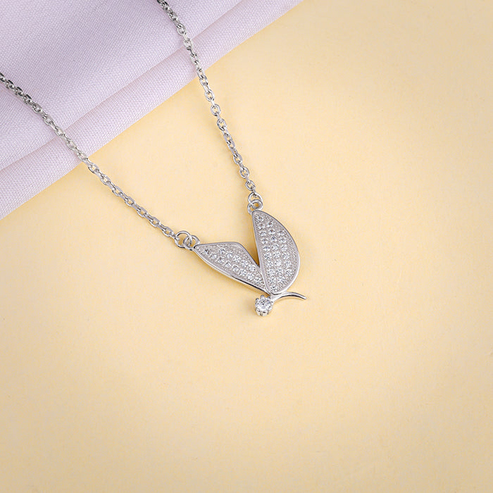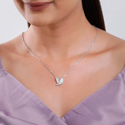 This silver necklace for women features a stylised mockingbird pendant. The entire pendant is paved with shimmering clear zircon stones.