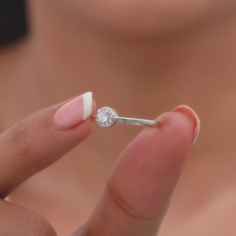 This silver ring features a circular design at the centre, where the outer circle is studded with zircons and the inside containing a single zircon stone.
