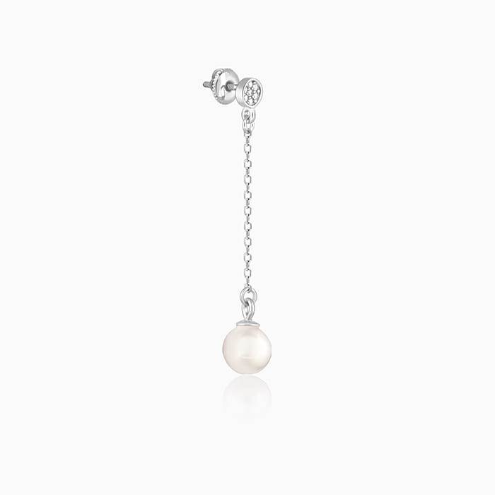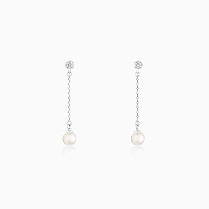 These silver earrings have studs embedded with zircon stones to which a drop of peal is attached.