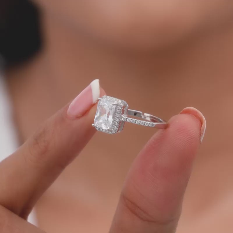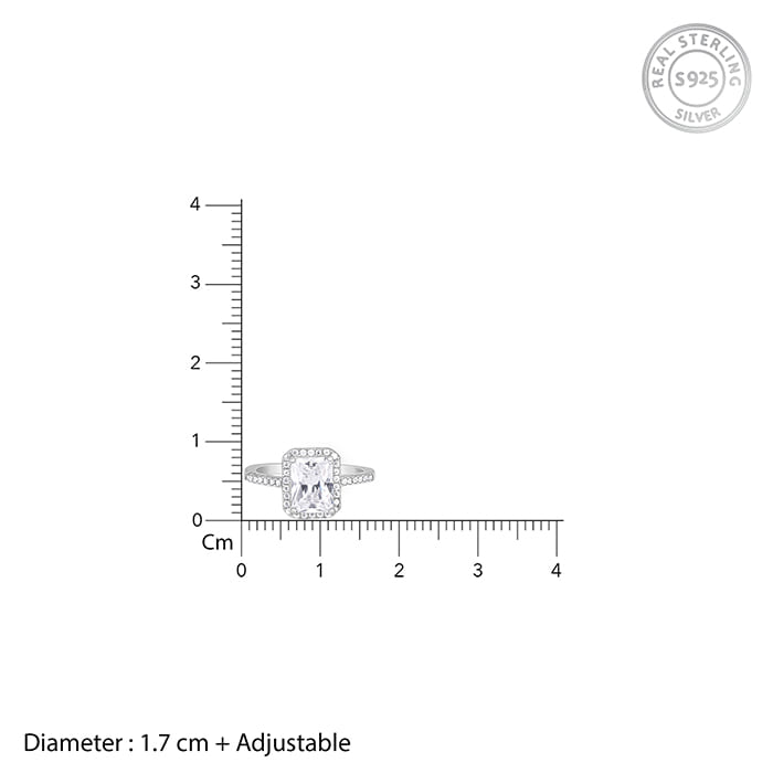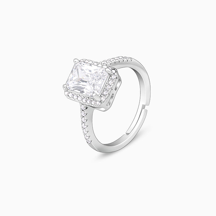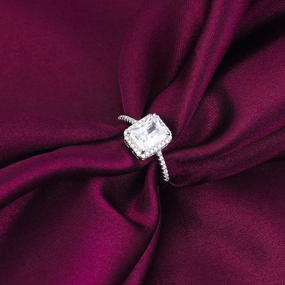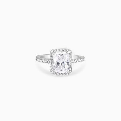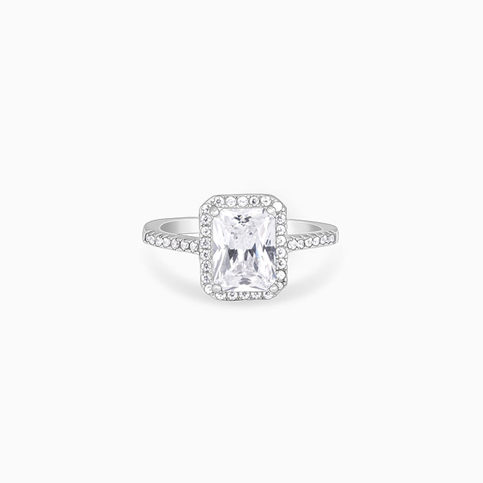 This silver ring features a rectangle cut single stone zircon with its outer frame studded with zircons as well.