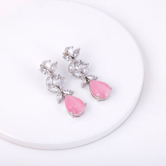 The silver earrings feature zircon studded leaves with pink stone droplets