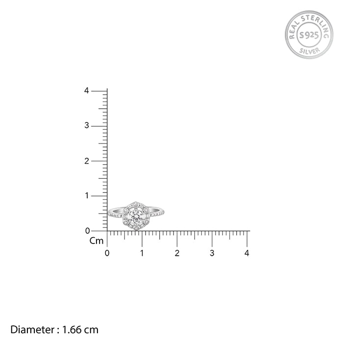 This silver ring has a hexagon design with a standout large zircon placed at the centre and additional zircons studded around and in the band.