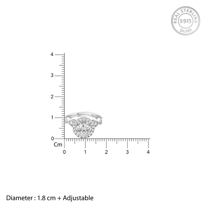Featuring a halo design this silver ring boasts a central large zircon encircled by smaller meticulously studded zircons.