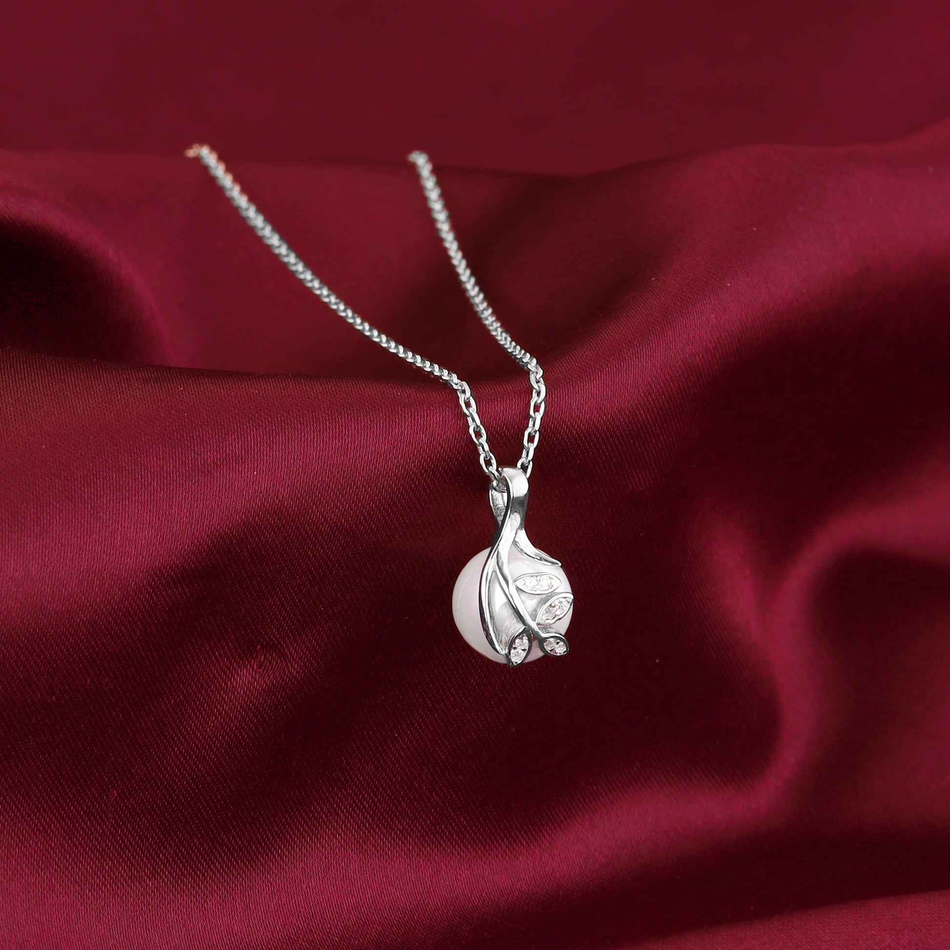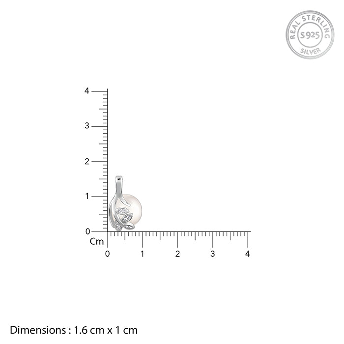 This silver pendant features a pearl with a creeper leaf on it studded with zircons.