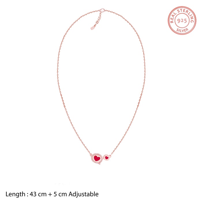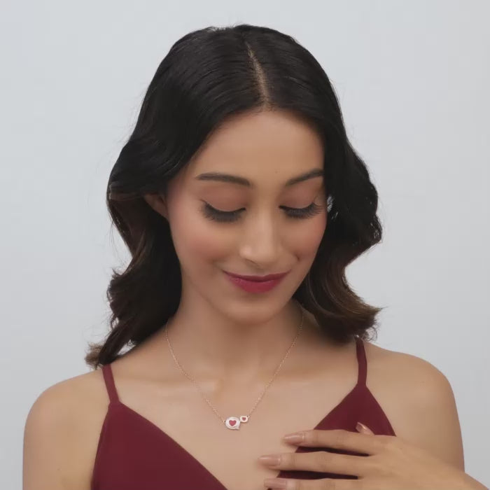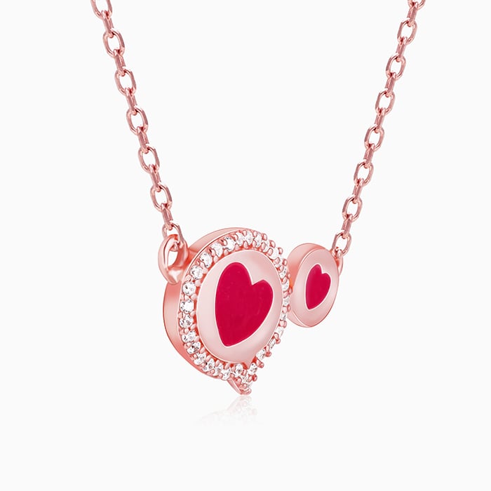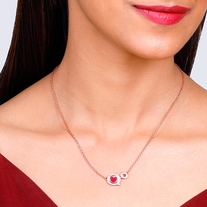 The rose gold necklace features a chat message design with a red heart design at the centre.