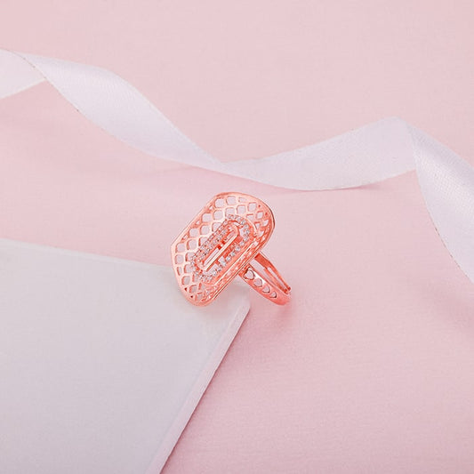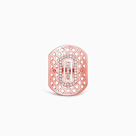 The Rose Gold necklace has a pendant with a filigree design and zircons studded on it, the chain has detail on it.