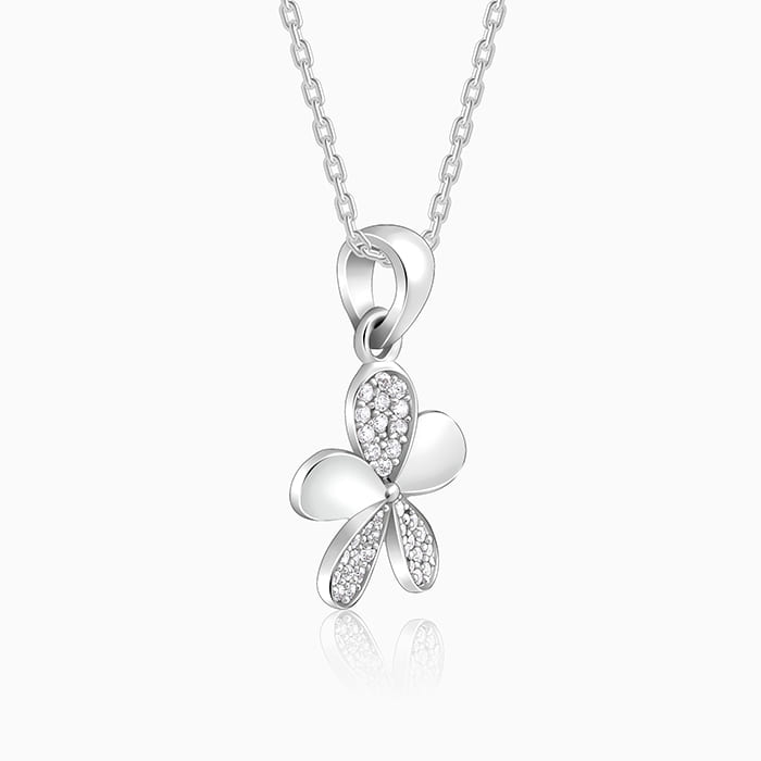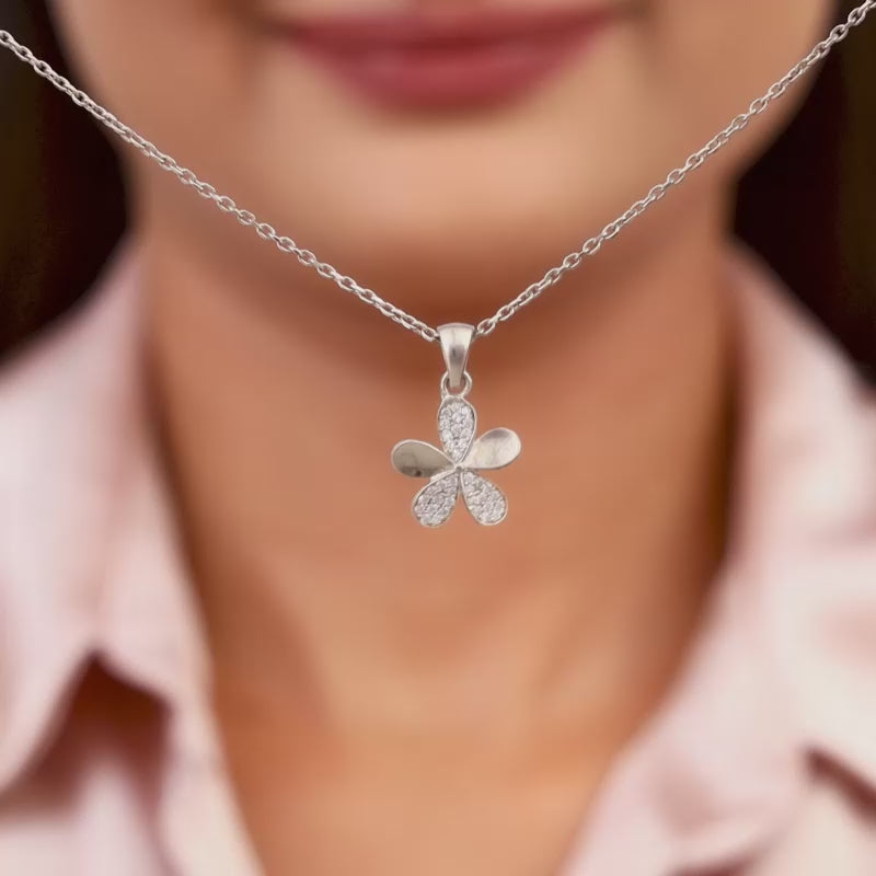 This silver pendant has a five-petal flower motif with zircons studded in three petals.
