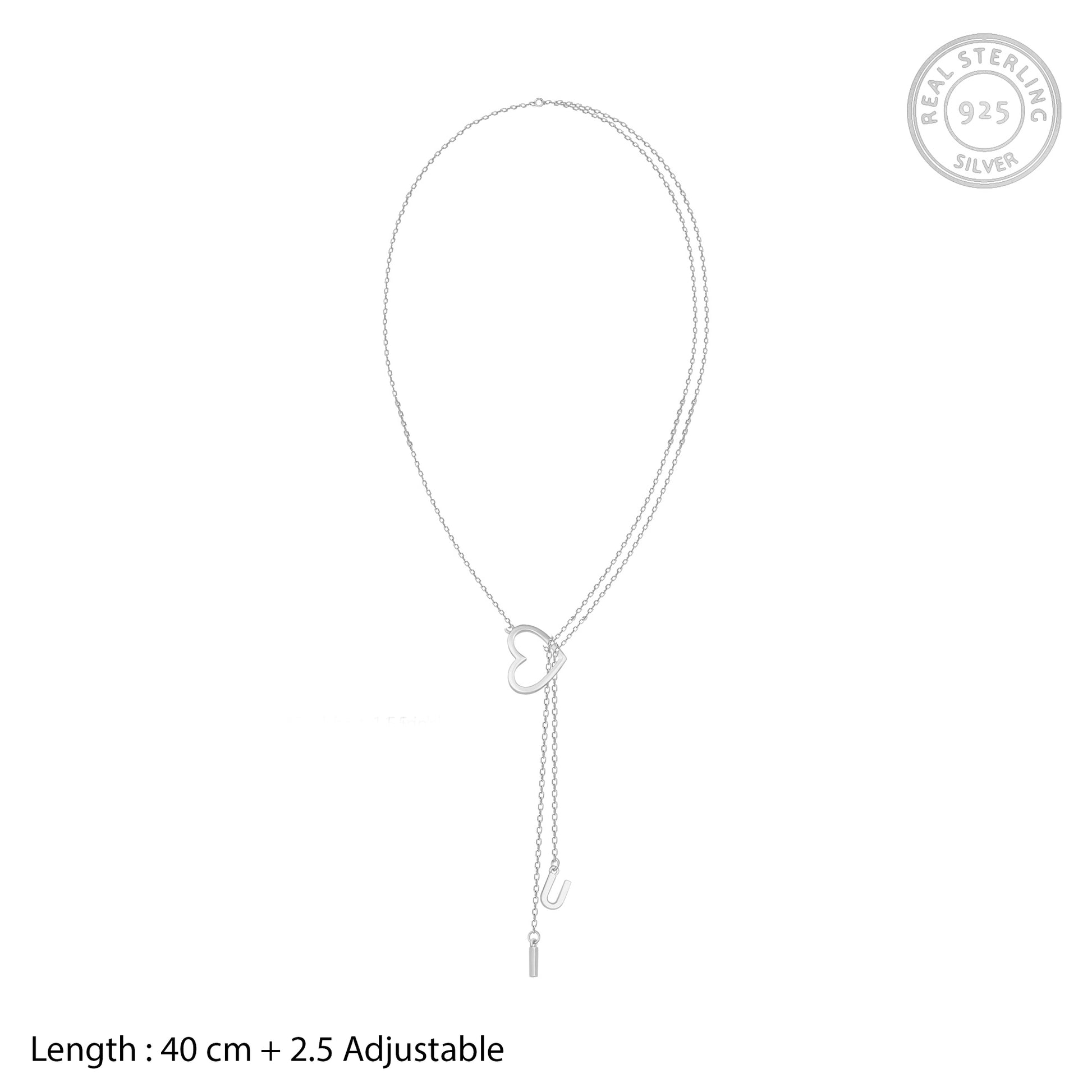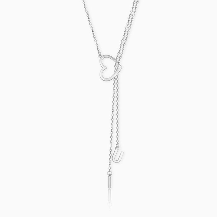 The Silver U&I Heart Necklace has the letters U and I dangling through a heart charm, all in silver finish.
