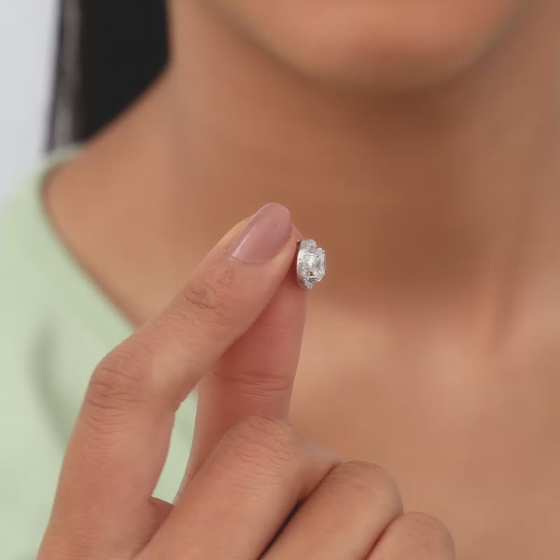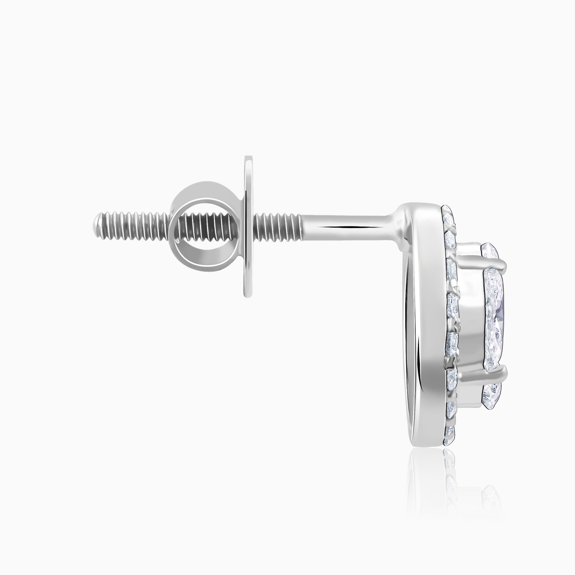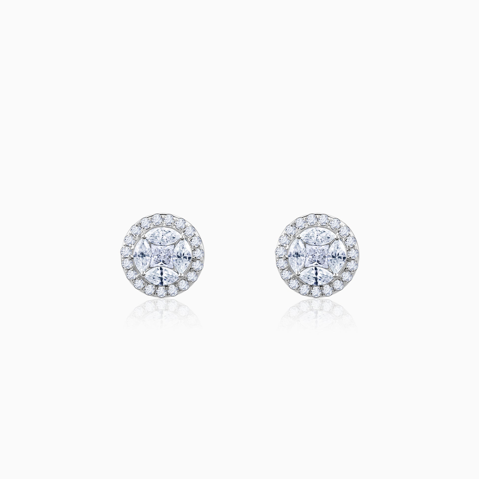 These pure white gold earrings for women feature a halo motif that is nestled with lab grown diamonds.