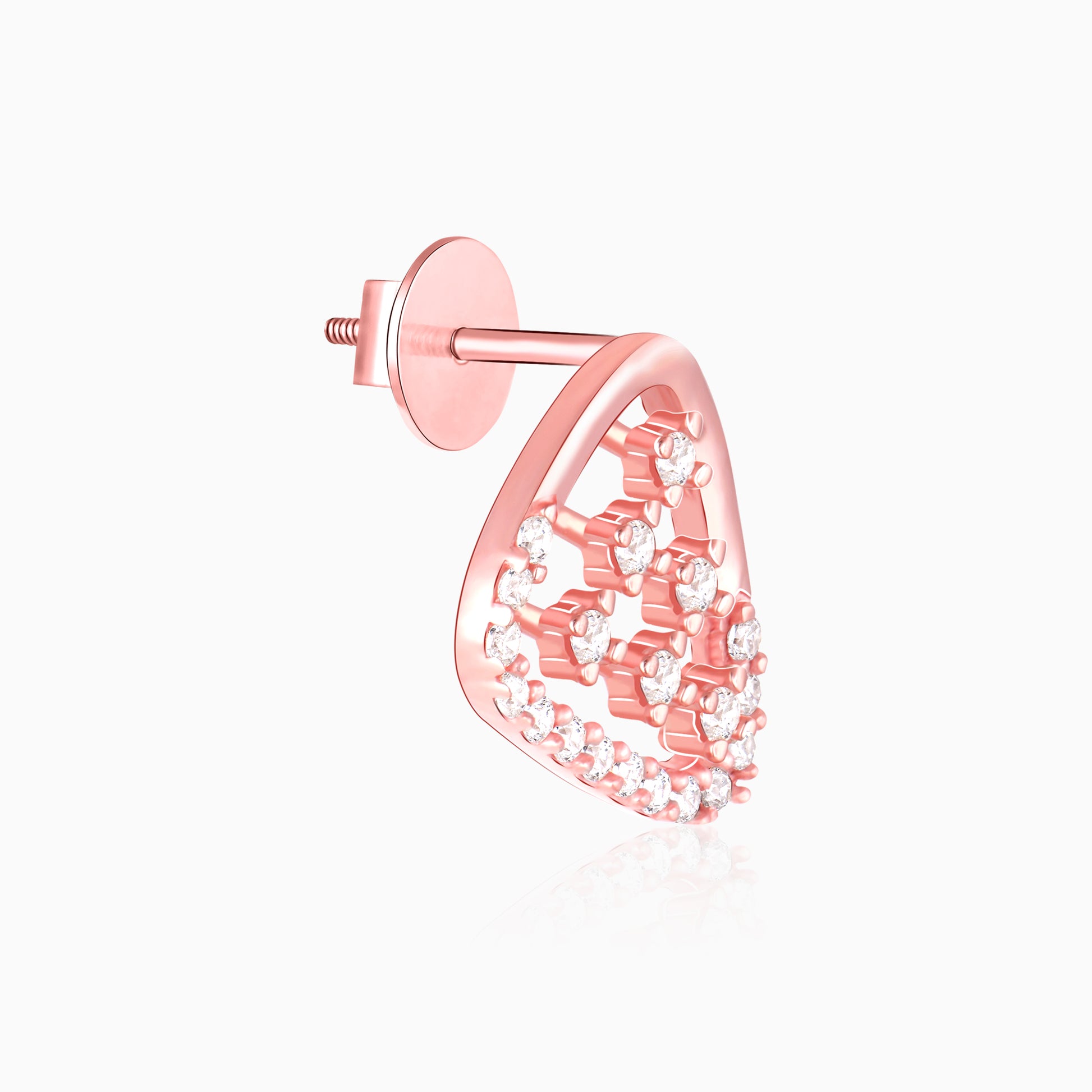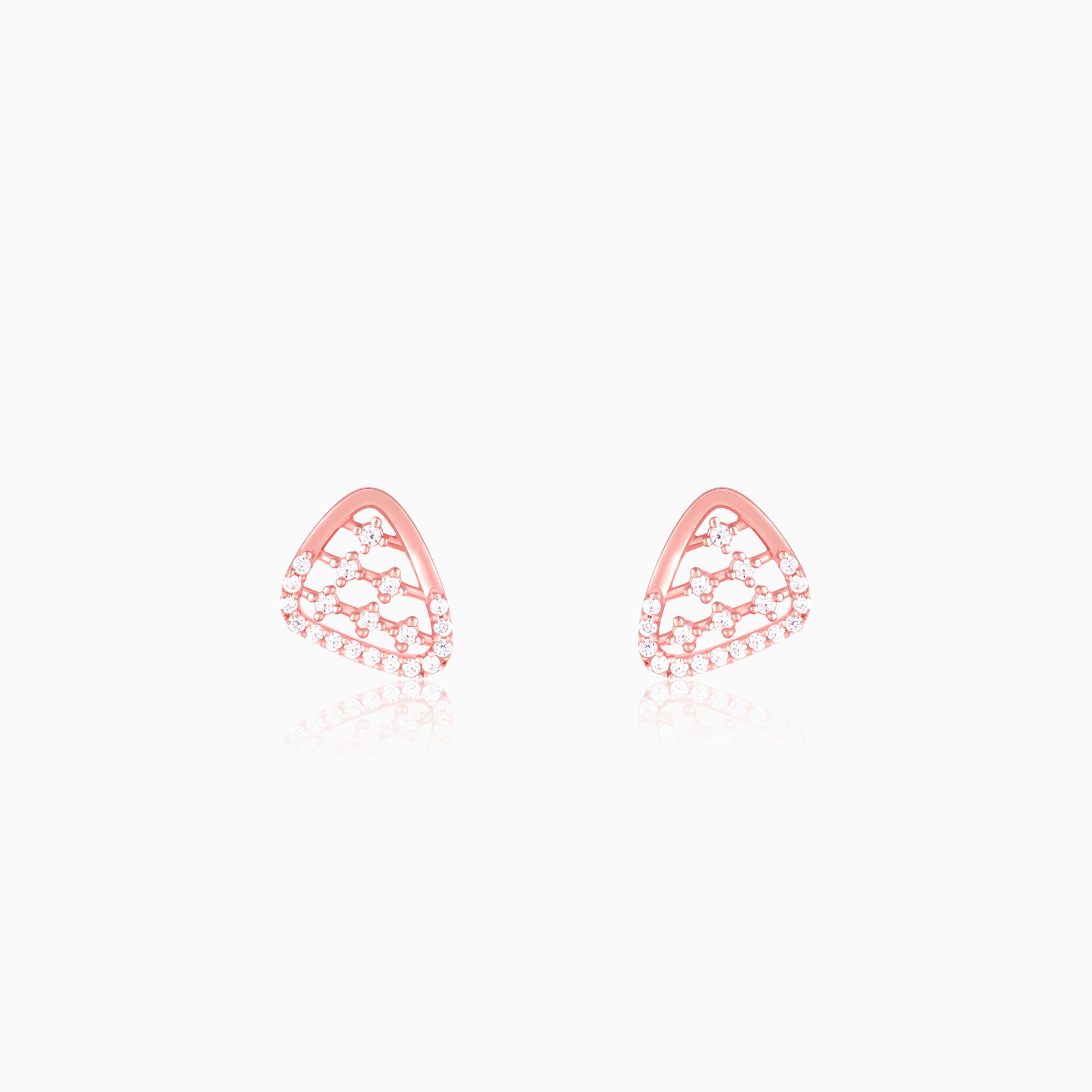 The Rose Gold Set-Square Earrings are triangle shaped with soft corners and horizontal lines studded with zircons.